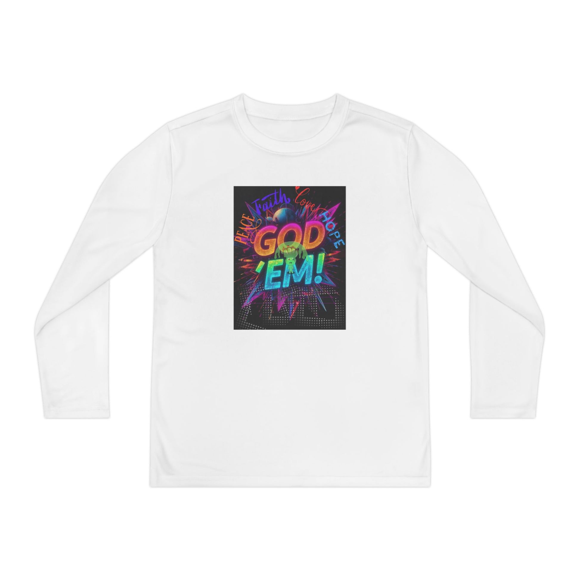 “GOD ‘EM!”- Youth Long Sleeve Tee - 'GOD EM!' Neon Graphic, Cool Vintage Shirts for Kids, Trendy Youth Apparel, Perfect Gift for Celebrations